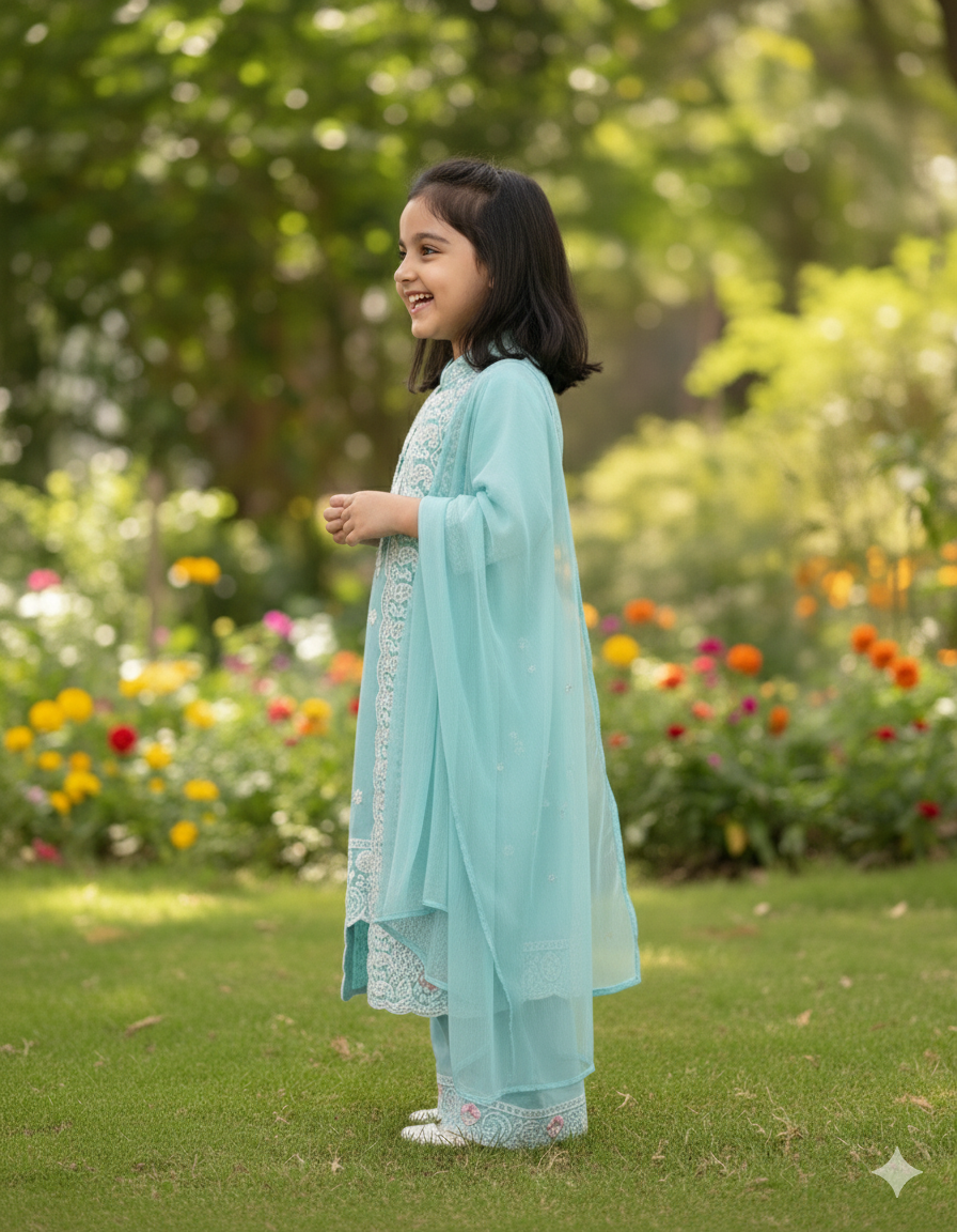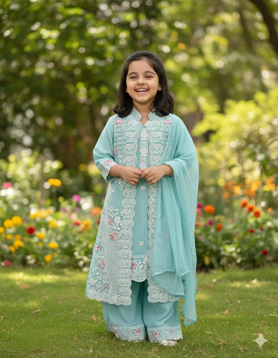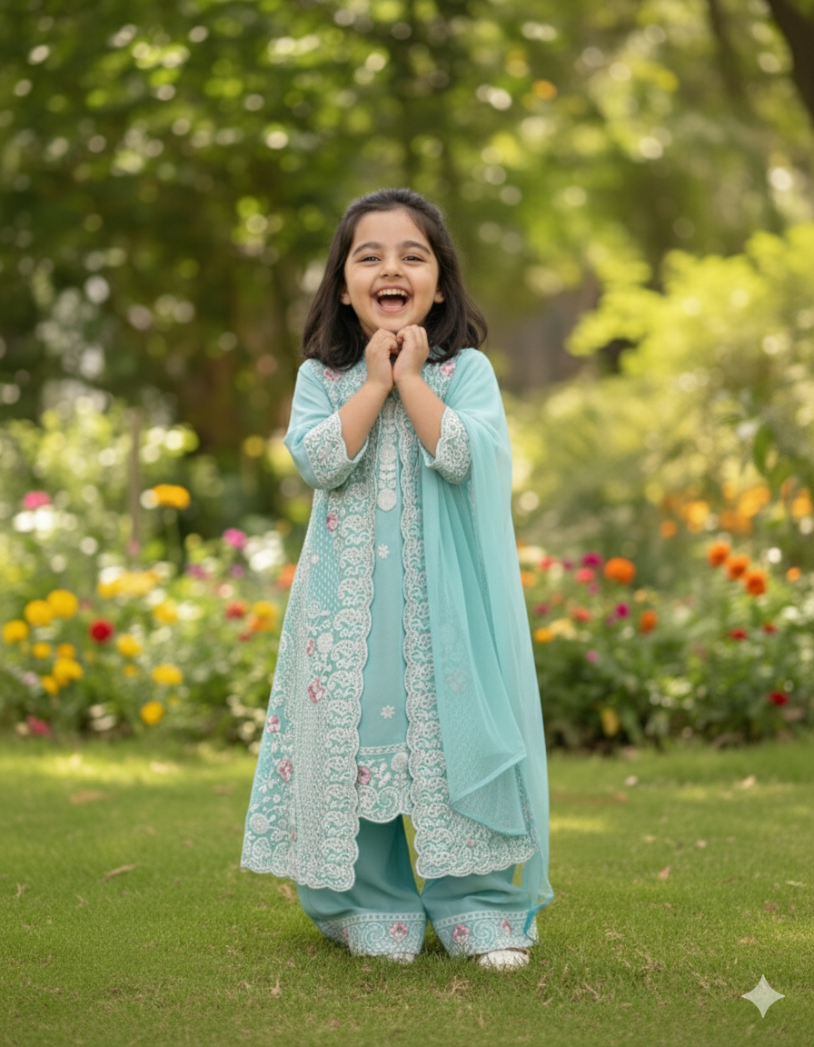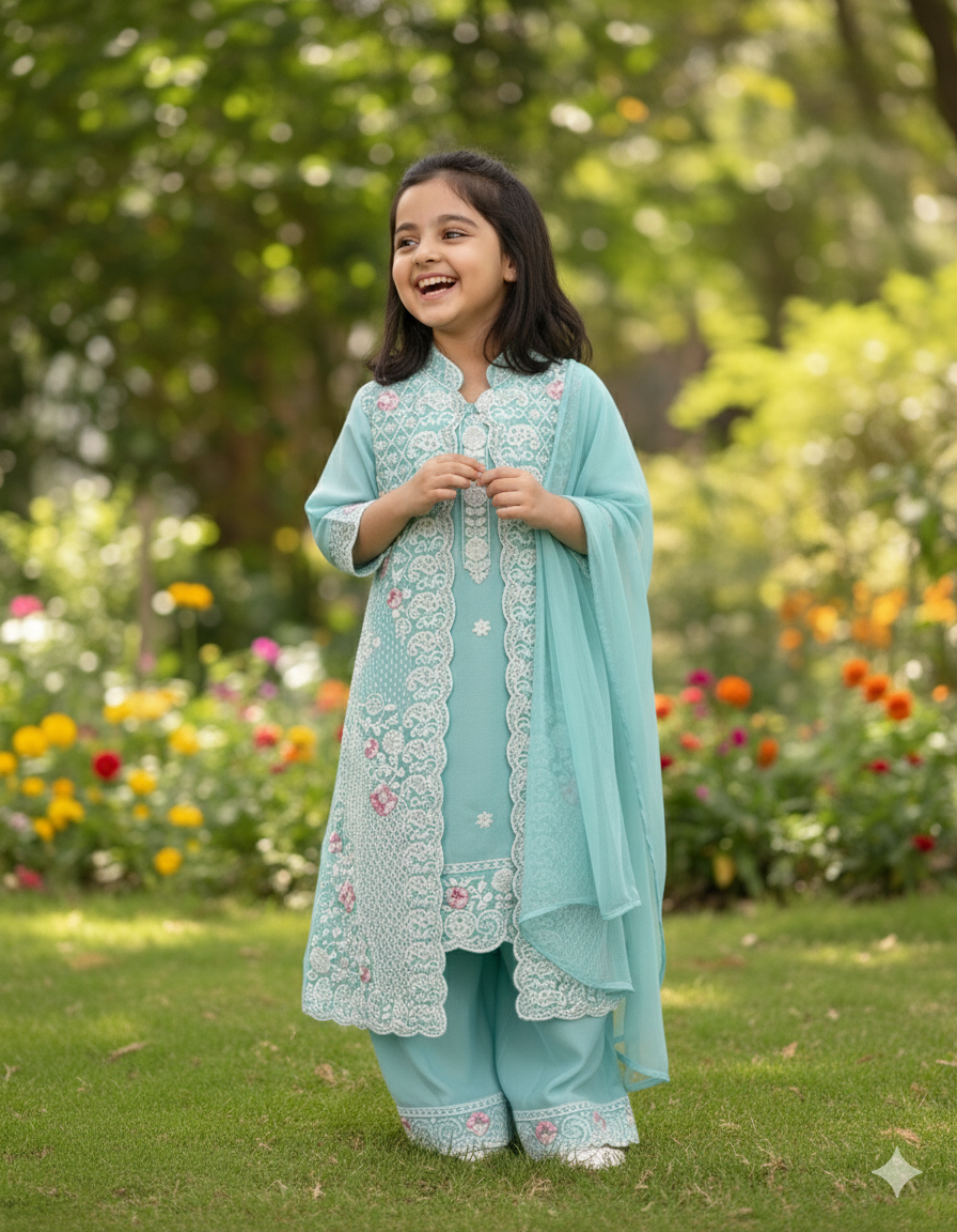 Let her twinkle with joy in our "Aqua Cloud" Embroidered Overcoat Set. This delightful four-piece ensemble, in a serene and refreshing aqua blue hue, is perfect for adding a touch of playful elegance and layered sophistication to any special day or festive occasion.