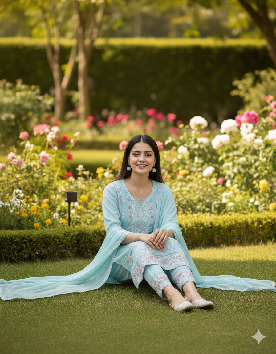 Step into fresh elegance with our "Arctic Blossom" Floral Embroidered Kurta Set. This enchanting three-piece ensemble, in a serene aqua blue hue reminiscent of a cool, clear day, is a perfect blend of traditional charm and contemporary style.