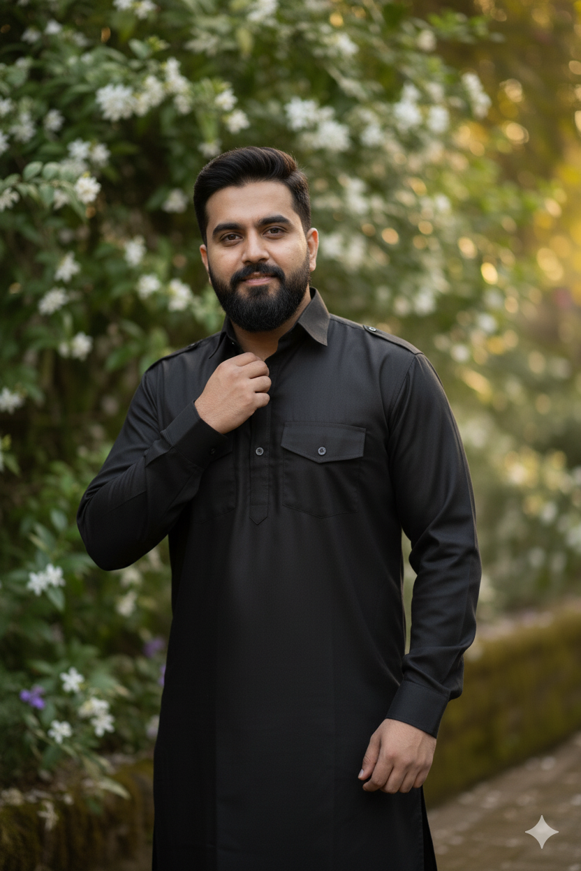 Elevate your traditional wardrobe with our Men’s Black Pathani Shalwar Kameez Set, a timeless ensemble that blends heritage with contemporary style. Crafted from high-quality fabric, this set is designed to provide both comfort and sophistication, making it a versatile choice for casual gatherings, festive occasions, or cultural events.