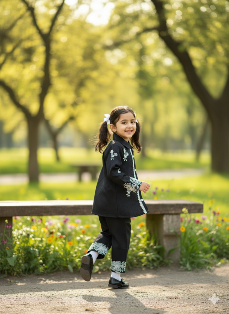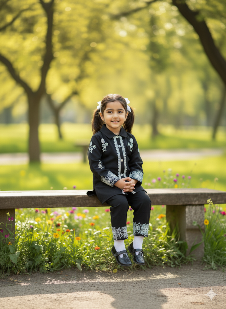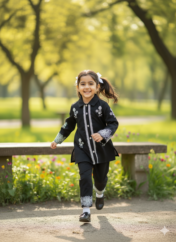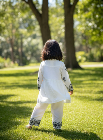 The flowing tunic features a classic round neckline and full-length sleeves, providing a comfortable and modest fit. The matching pants are designed for ease of movement, allowing your child to play and explore in style. This versatile outfit is a must-have for any young fashionista's wardrobe.