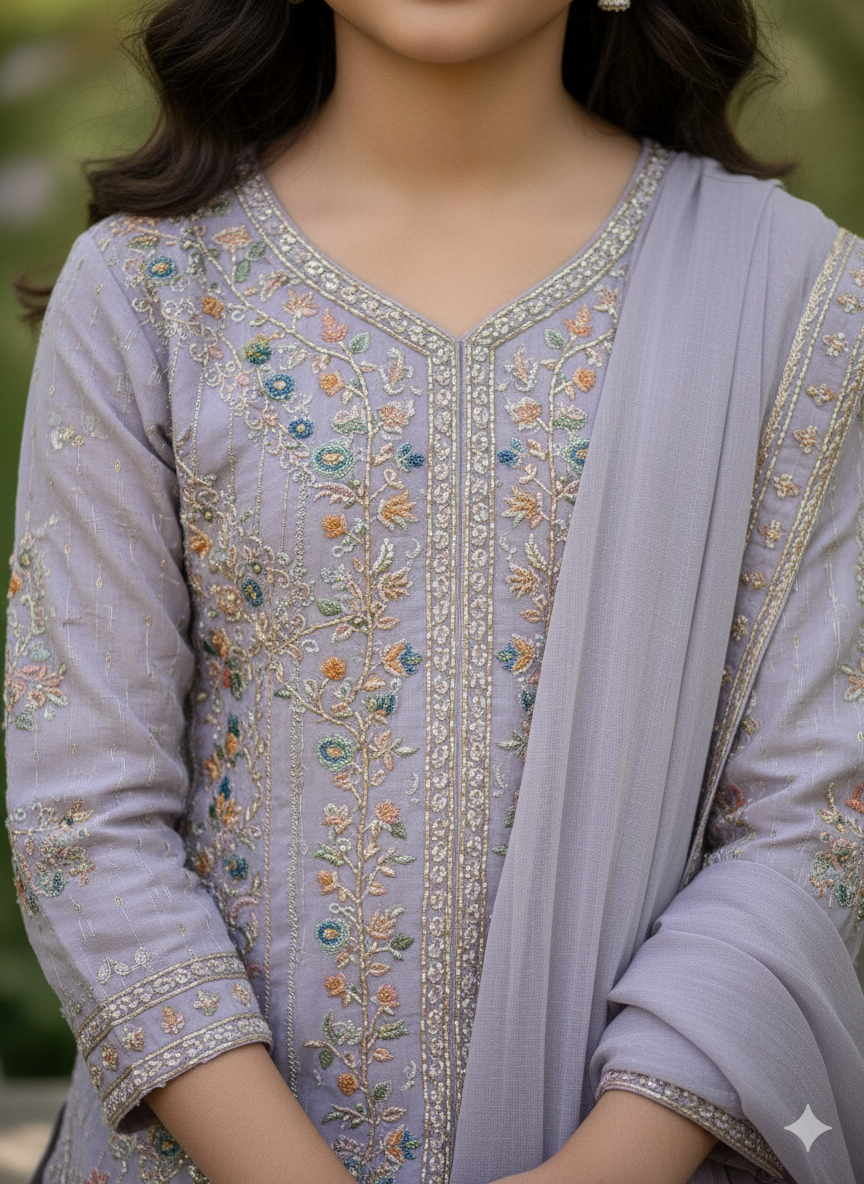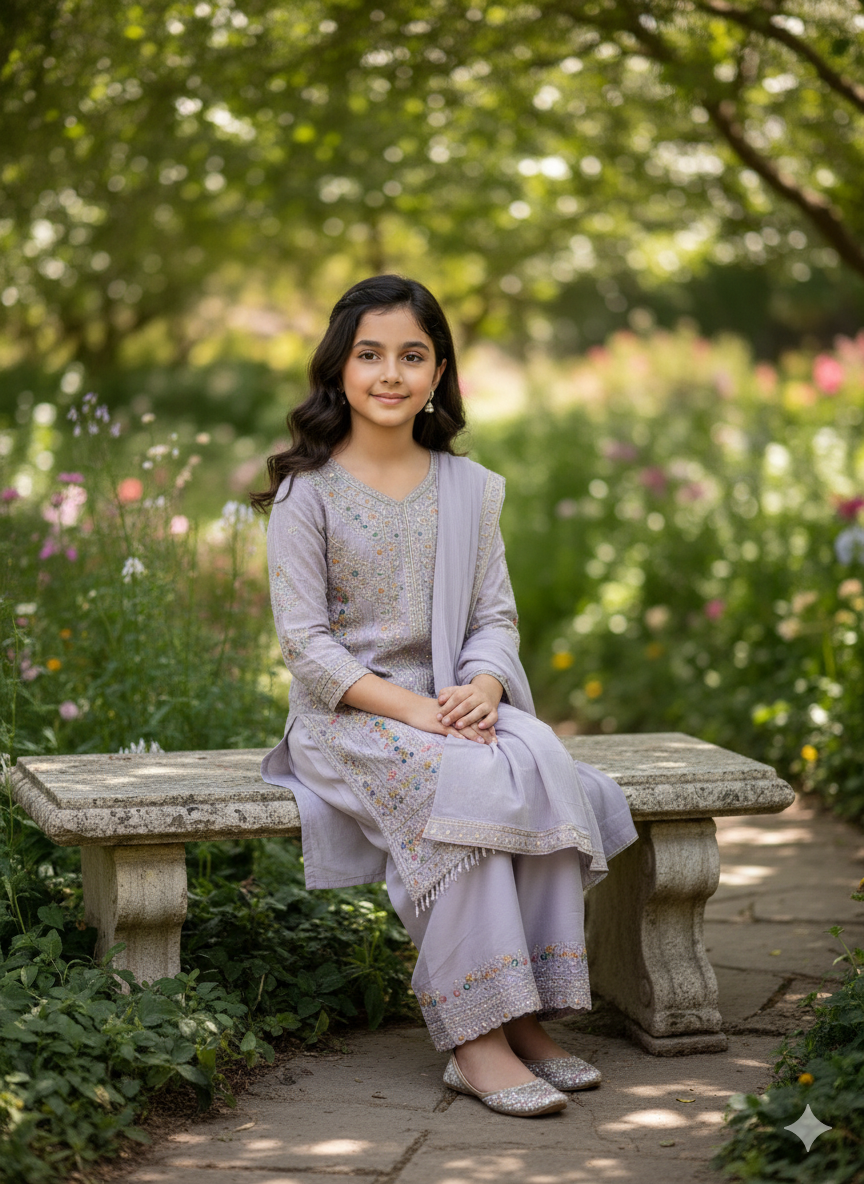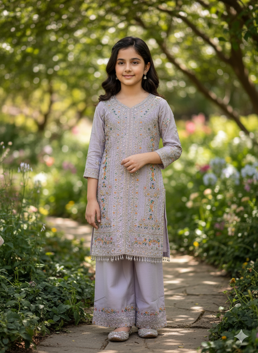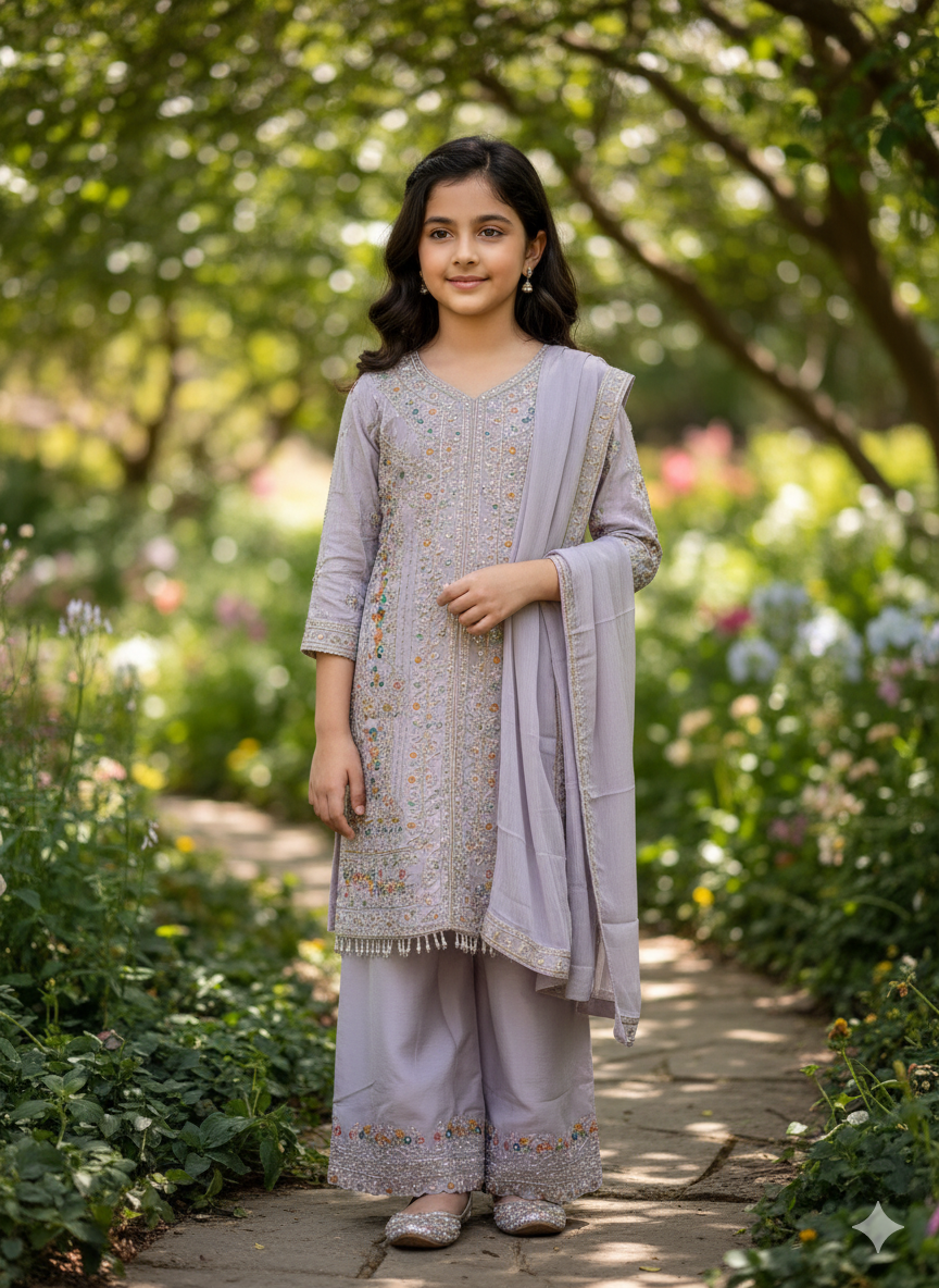 Let her delightful spirit shine in our "Frosty Lavender" Embellished Palazzo Set. This enchanting three-piece ensemble, in a soft and delicate light lavender hue, is perfect for bringing a touch of serene charm and captivating sparkle to any occasion, from festive celebrations to parties.