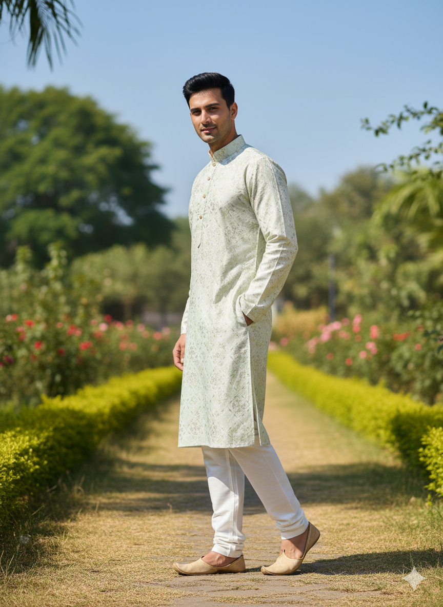 Paired with crisp, comfortable white pajama bottoms, this set offers a harmonious and distinguished look. Crafted from a breathable fabric, the "Heritage Green" Kurta Pajama Set ensures ease of wear and a dignified presence.