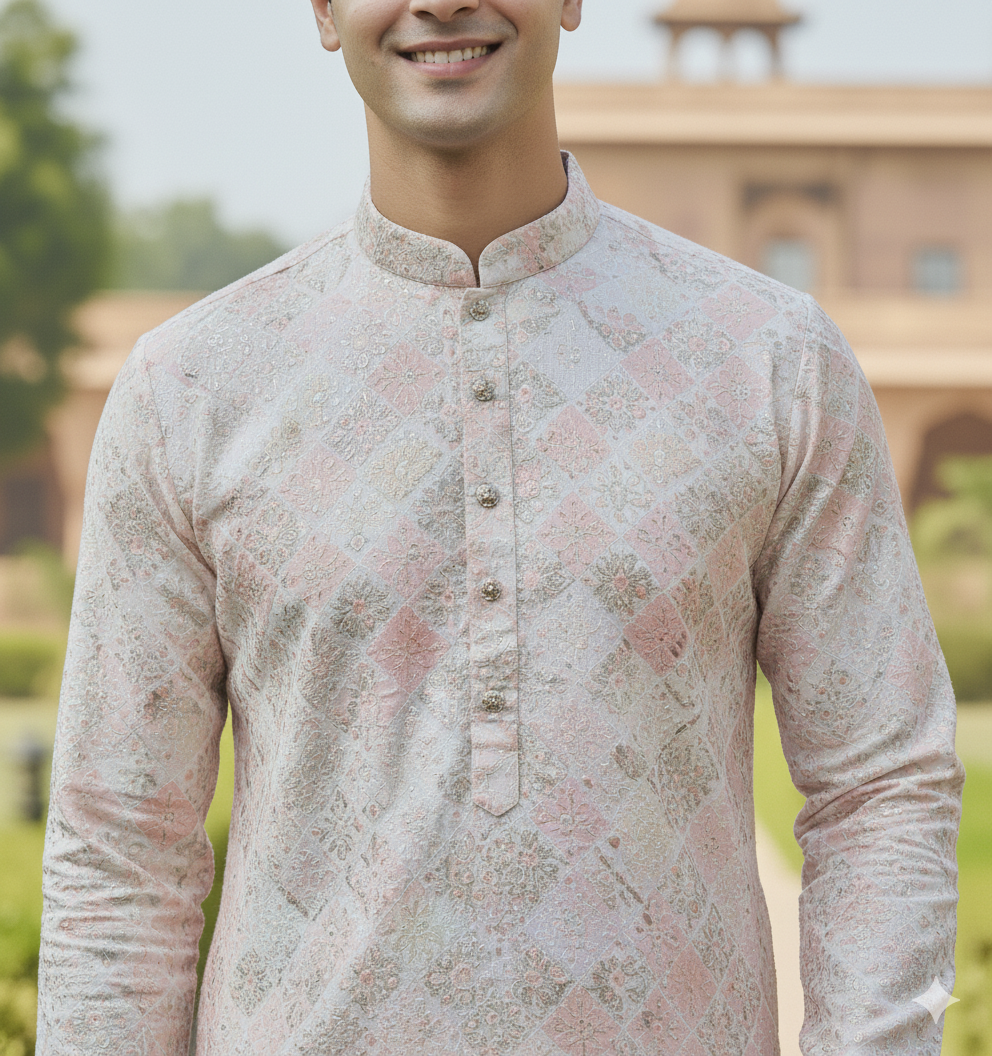 The kurta features a soft, elegant base with a unique geometric and floral jaquard pattern in muted tones of light pink, white, and subtle silver. It is beautifully enhanced with intricate silver thread embroidery and delicate sequin work (or similar embellishment, based on Image 3 showing sparkle), creating a rich texture and subtle shimmer. The mandarin collar and button placket are finished with polished, coordinating buttons, adding a touch of classic sophistication.