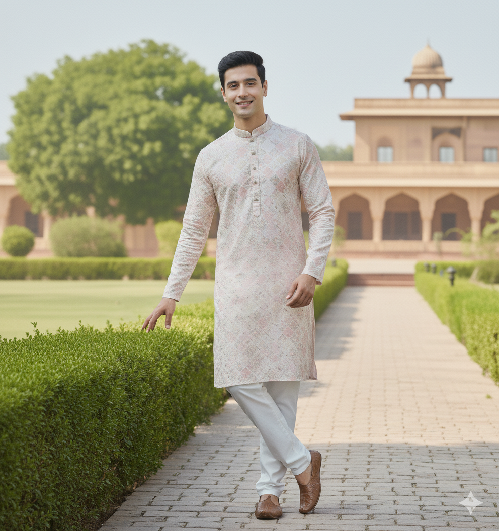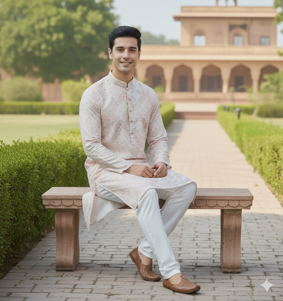 Paired with crisp, comfortable white pajama bottoms, this set offers a harmonious and distinguished look. Crafted from a breathable fabric, the "Heritage Peach" Kurta Pajama Set ensures ease of wear and a dignified presence.