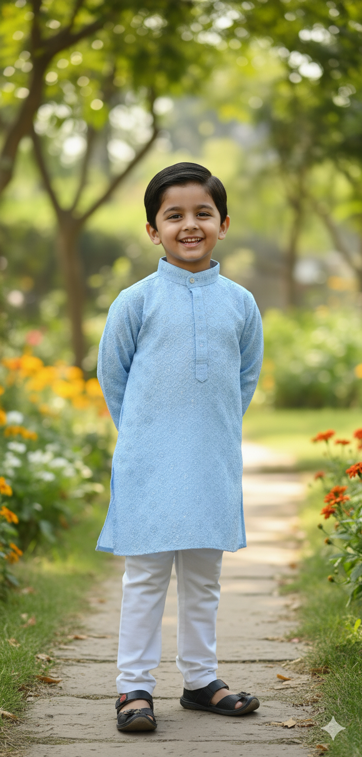 Dress your little gentleman in our charming "Icy Blue" Embroidered Kids Kurta Pajama Set, perfect for adding a touch of sophisticated calm and cool elegance to any special occasion. This delightful ensemble combines a soothing, crisp color with intricate detailing, making it ideal for festive celebrations, family events, or daytime cultural gatherings.
