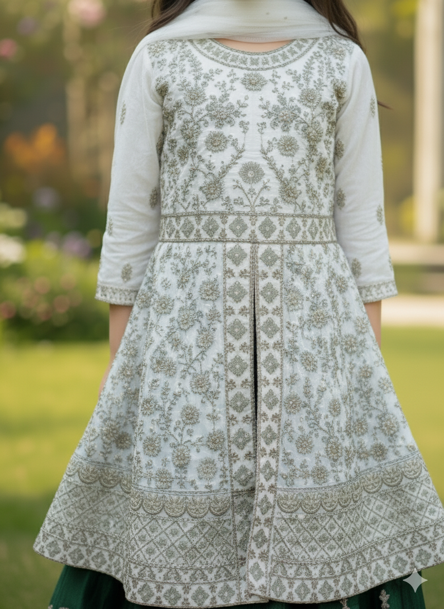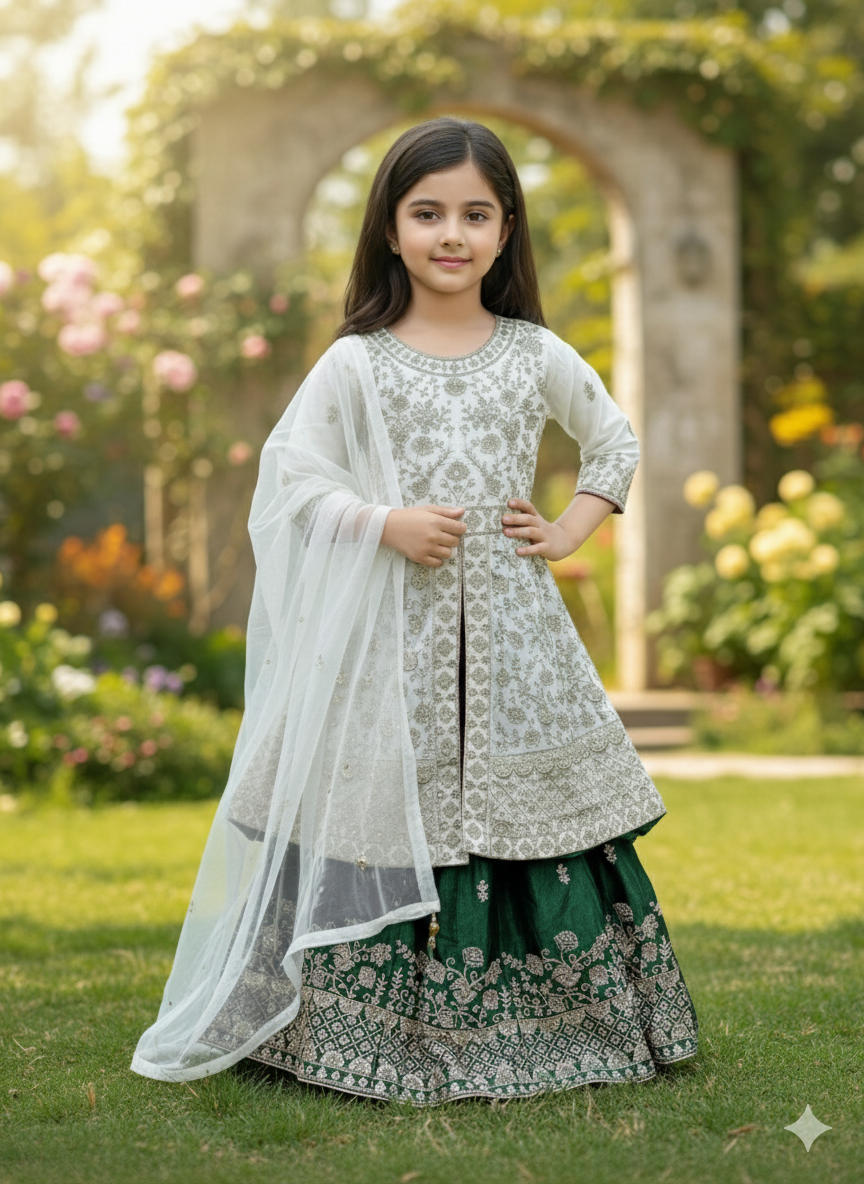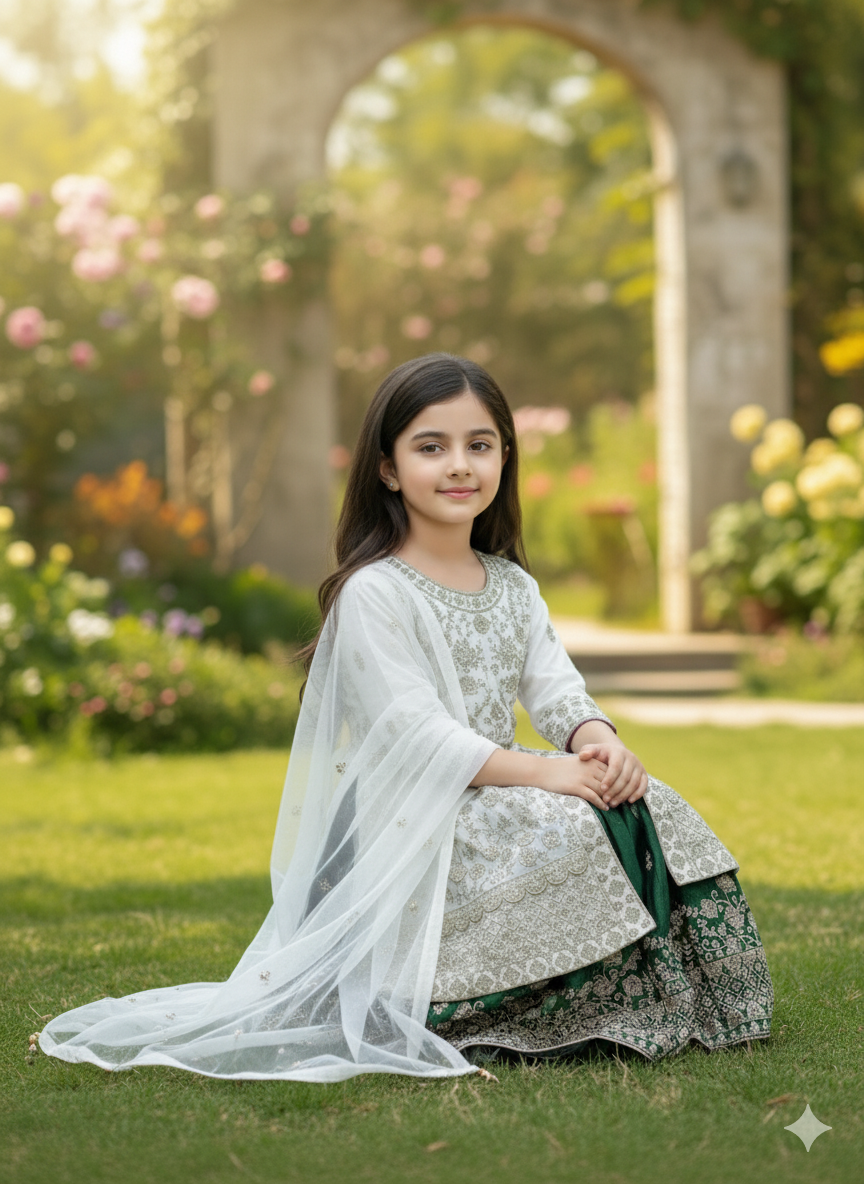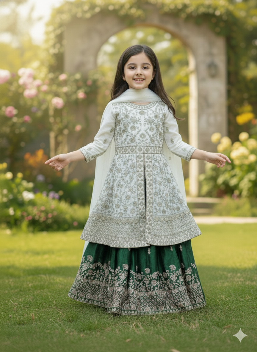 Designed for both breathtaking beauty and comfortable movement, the "Majestic Emerald" Sharara Set will ensure your little one feels like royalty while celebrating with ease and confidence.