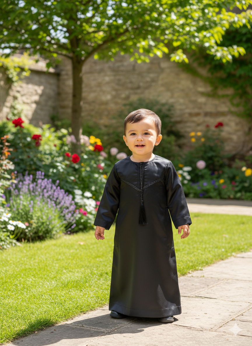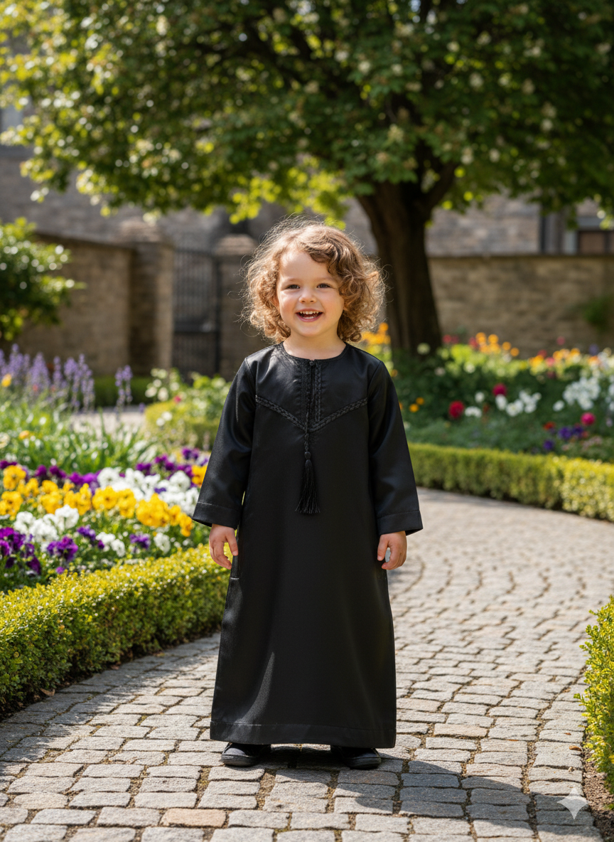 Command attention with our "Midnight Majesty" Boys' Tunic, a distinguished piece that blends classic style with modern comfort. Crafted from a luxurious, smooth fabric in a deep, rich black, this tunic exudes sophistication. It features a unique collarless neckline, elegantly adorned with intricate black braided detailing that extends across the chest and culminates in a refined matching tassel. The relaxed fit and comfortable full-length sleeves ensure freedom of movement, making it an ideal choice for formal gatherings, festive occasions, or simply adding a touch of bold elegance to everyday wear. This versatile black tunic is a timeless addition to any young gentleman's wardrobe, effortlessly pairing with various bottoms