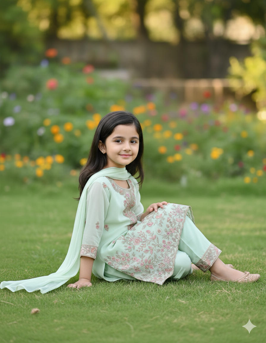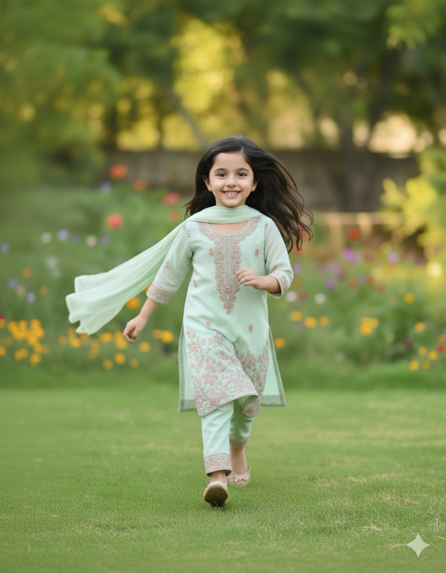 Crafted from a soft, breathable fabric, the "Mint Meadow" Kurta Set is ideal for festive gatherings, parties, or any special day where your child wants to look and feel enchanting.