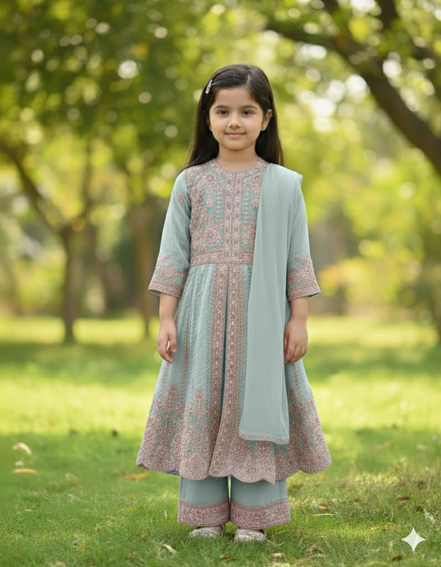 Crafted from a soft, breathable fabric in a charming shade of sky blue, this three-piece set features intricate silver embroidery and stones that mimics delicate floral patterns, adding a touch of traditional grace. The A-line kurta boasts a comfortable fit and a flattering silhouette, while the matching palazzos ensure ease of movement for playful adventures. A coordinating dupatta completes the look, adding an extra layer of sophistication.
