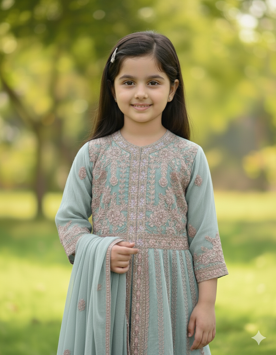 Step into a world of whimsical elegance with our Sky Flora. This delightful ensemble is perfect for your little one, whether she's attending a festive celebration, a family gathering, or simply enjoying a day out.