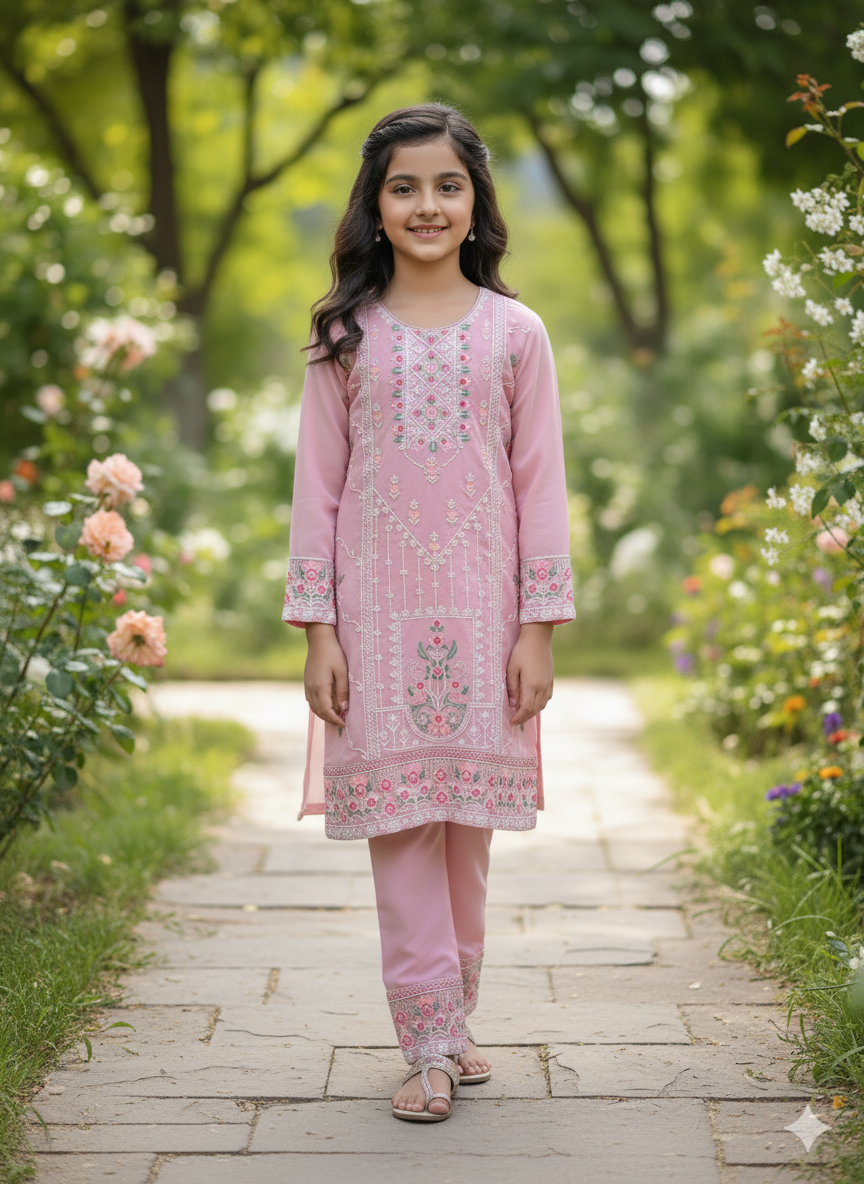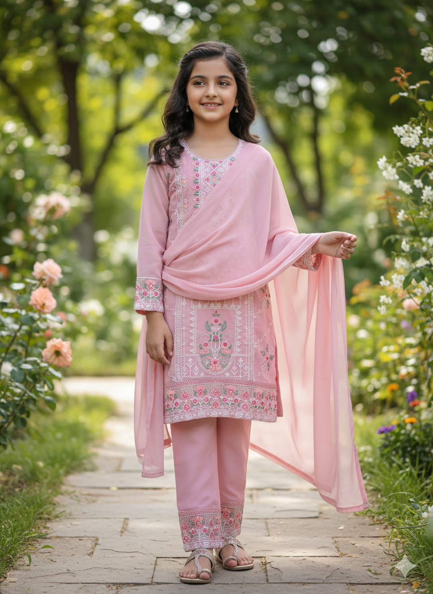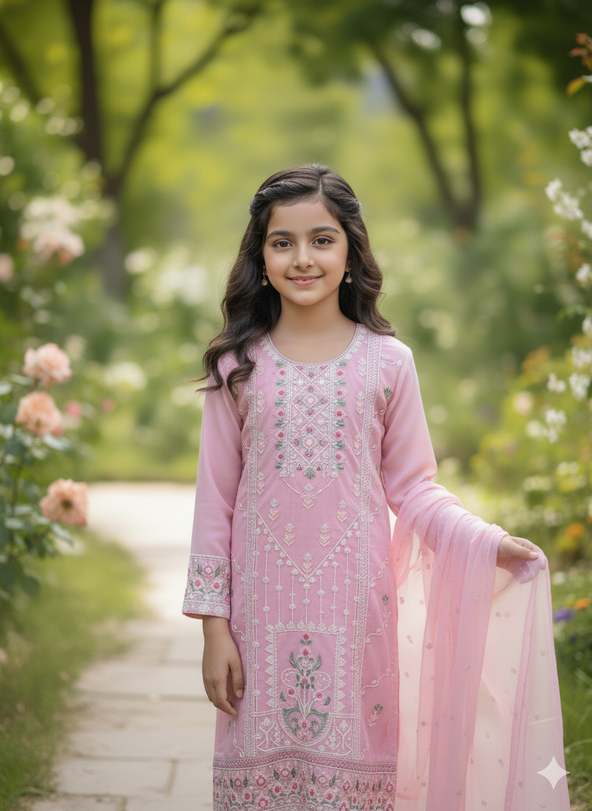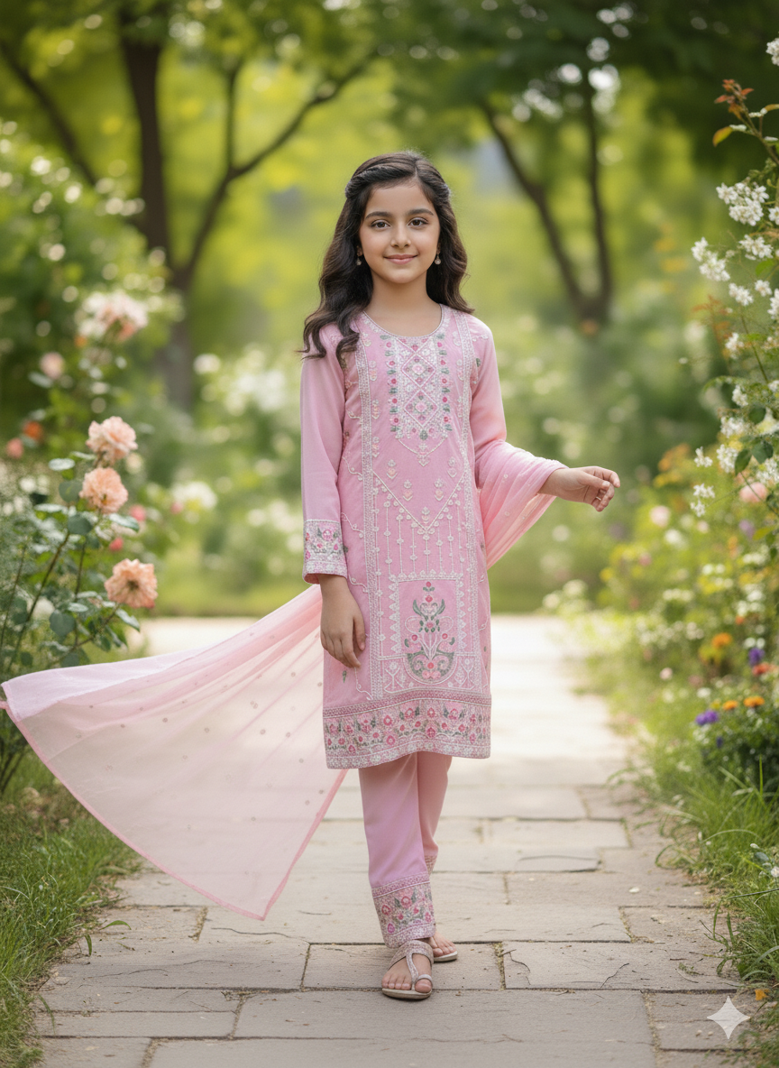 Step into fresh elegance with our "Rose Blossom" Floral Embroidered Set. This enchanting three-piece ensemble, in a serene pink hue reminiscent of a cool, clear day, is a perfect blend of traditional charm and contemporary style.