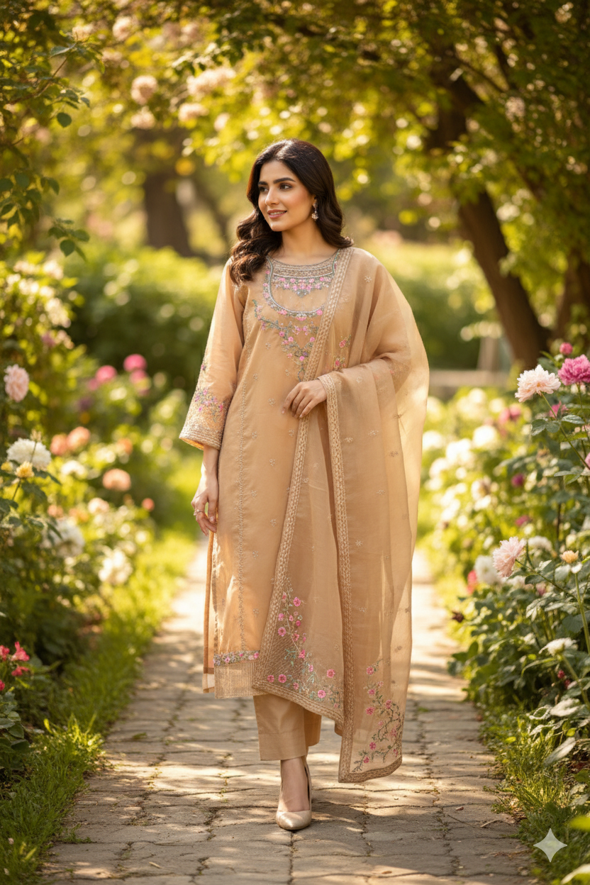 Embrace the delicate charm of spring with our “Whispers of Spring” Salwar Kameez, a vision of soft peach hues and intricate floral embroidery. This graceful three-piece ensemble is perfect for daytime events, festive gatherings, or any occasion where you desire a touch of understated elegance.