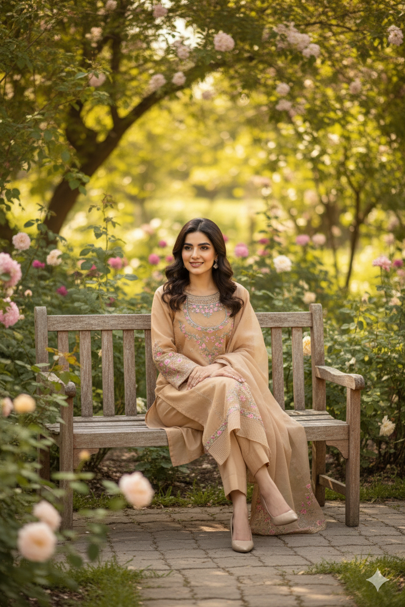 A beautifully crafted Kameez (Shirt): The soft peach shade creates a warm and flattering canvas for the exquisite embroidery that adorns the neckline, sleeves, and hem. Delicate pink and green floral motifs, accented with subtle metallic highlights, evoke the freshness of a blooming garden. The high-quality fabric drapes beautifully and offers a comfortable fit. The sleeves are thoughtfully designed to a modest length, adding to the overall grace of the outfit.
