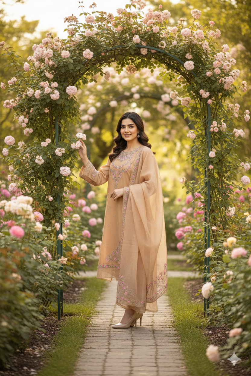 A complementing Dupatta (Shawl): The matching dupatta, in a slightly deeper shade of peach, enhances the overall look. It features a border of meticulously embroidered flowers, echoing the detail on the kameez. The lightweight fabric allows for effortless draping, adding a touch of ethereal beauty.